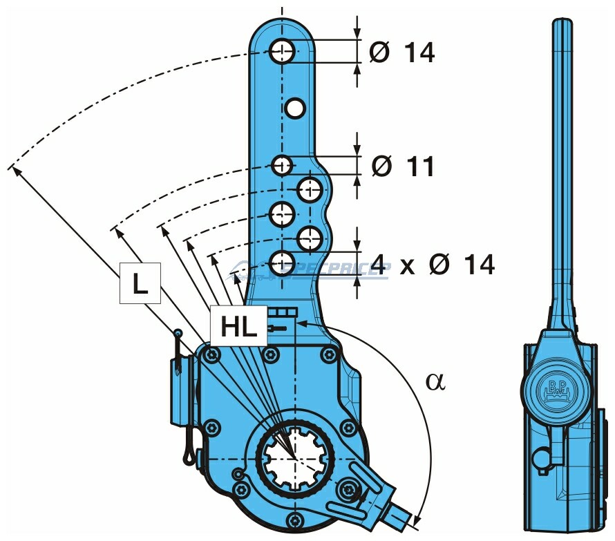 Длина рычага (HL) 120 / 135 / 150 / 165 = O 14 / L 180 = O 11 / 250 = O 14